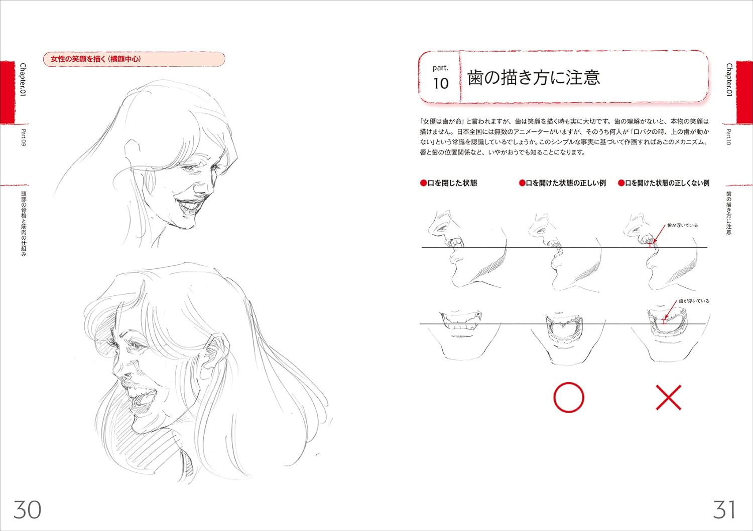 Balance of the 8 basic head-to-body diagrams/Balance of a man in the rule of thirds/Differences between men and women in the rule of thirds/Balance of a woman in the rule of thirds/Balance of the head/How to draw a man's head/How to draw a woman's head/How to draw the face first/How the head's skeleton and muscles work/Pay attention to how you draw the teeth/How fat and sagging in the head work/How the arm's muscles work/How the arm's skeleton and muscles work/Points to remember when drawing an elbow/How the clavicle and sternocleidomastoid work/How the shoulder blade works/How the foot works/Quick reference table for muscle functions/How the hand works/How to draw ears/How wrinkles work/Drawing using only your imagination/Points for action scenes/Practice questions