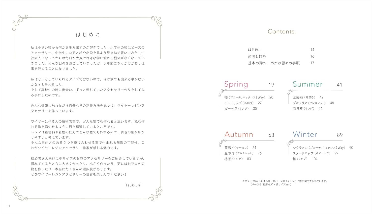You can make 12 types of delicate, transparent flowers (14 types including variations) for each season using wire and resin. All steps are explained with photos, from basic wirework to tips on gradation.