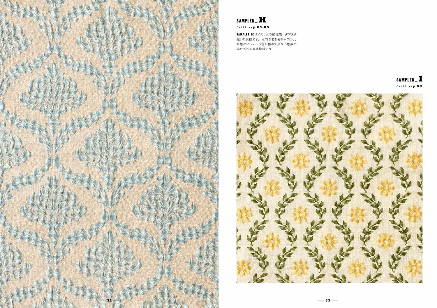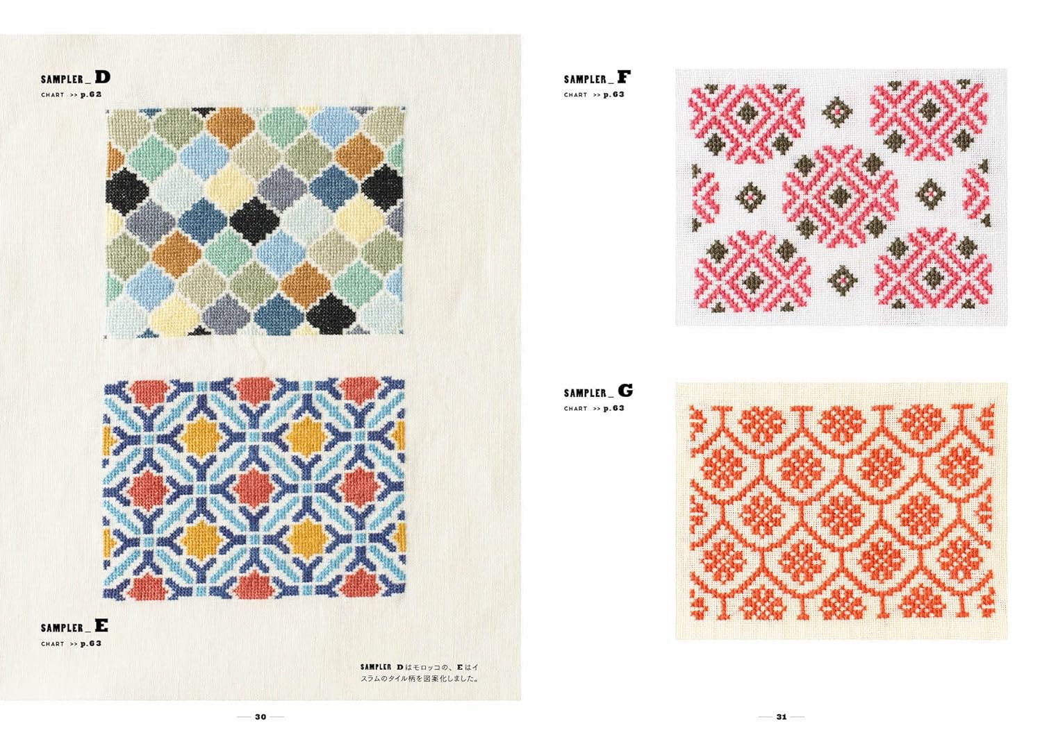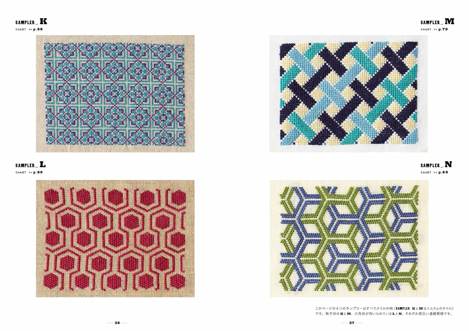Cross-stitch designs based on Moroccan tiles, Indonesian textile ``ikat'', Islamic textile ``damask'', and geometric patterns drawn with Bargello embroidery.