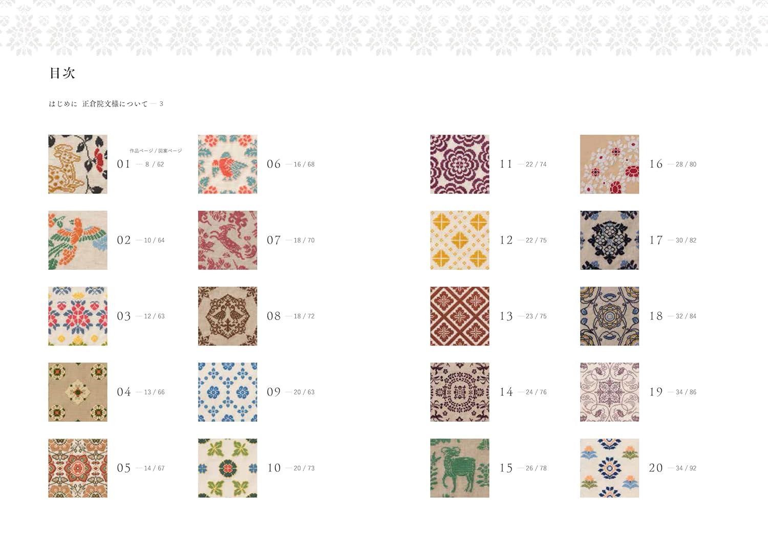 A collection of designs of the patterns depicted in the Shosoin treasures by the popular author of "Japanese Patterns" and "Kimono Patterns." The book features the oldest classical Japanese patterns, such as plants such as karahana and arabesque, and animals such as deer and birds, all of which have an exotic charm.