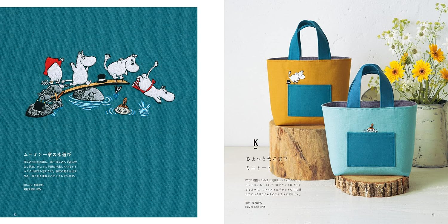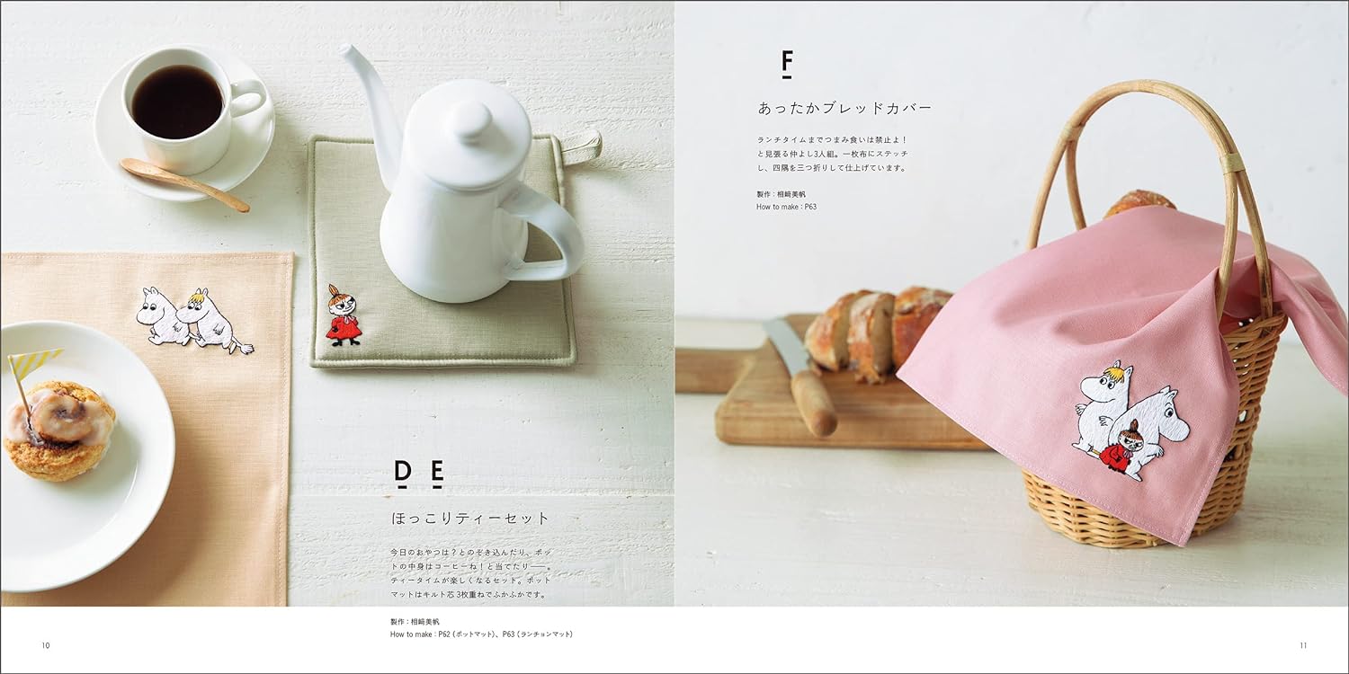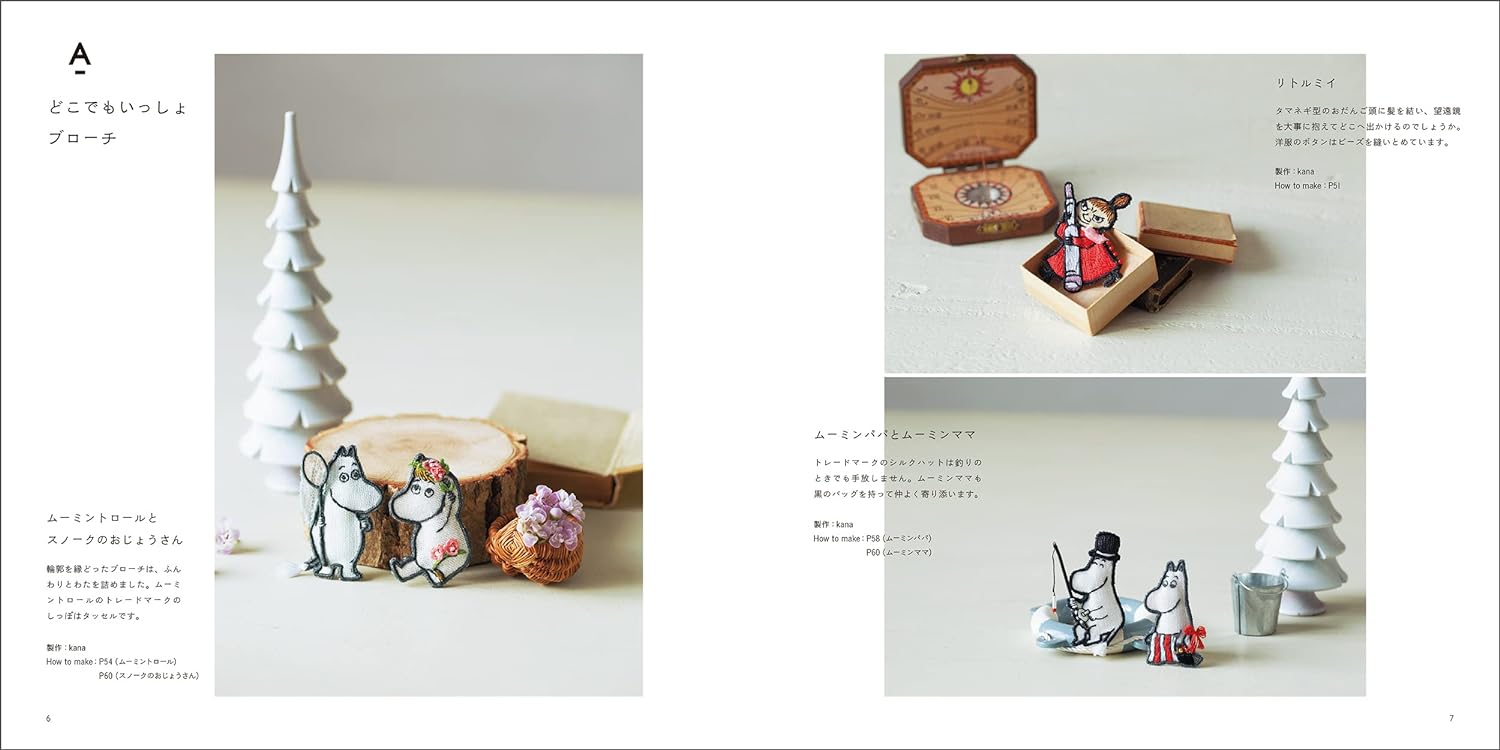A. Anywhere together brooch, B. Handkerchief, C. One point for blouse, DE. Warm tea set, F. Warm bread cover, G. Leaf and tree bookmark, H. Painter's sketchbook, I. Moomin Yashiki and good friends frame, J. Petanko Mini Kinchaku, K. Before we start making the mini tote, L flower coaster, sampler embroidery, let's make a Little My brooch, let's make a Moomintroll brooch, How to make,