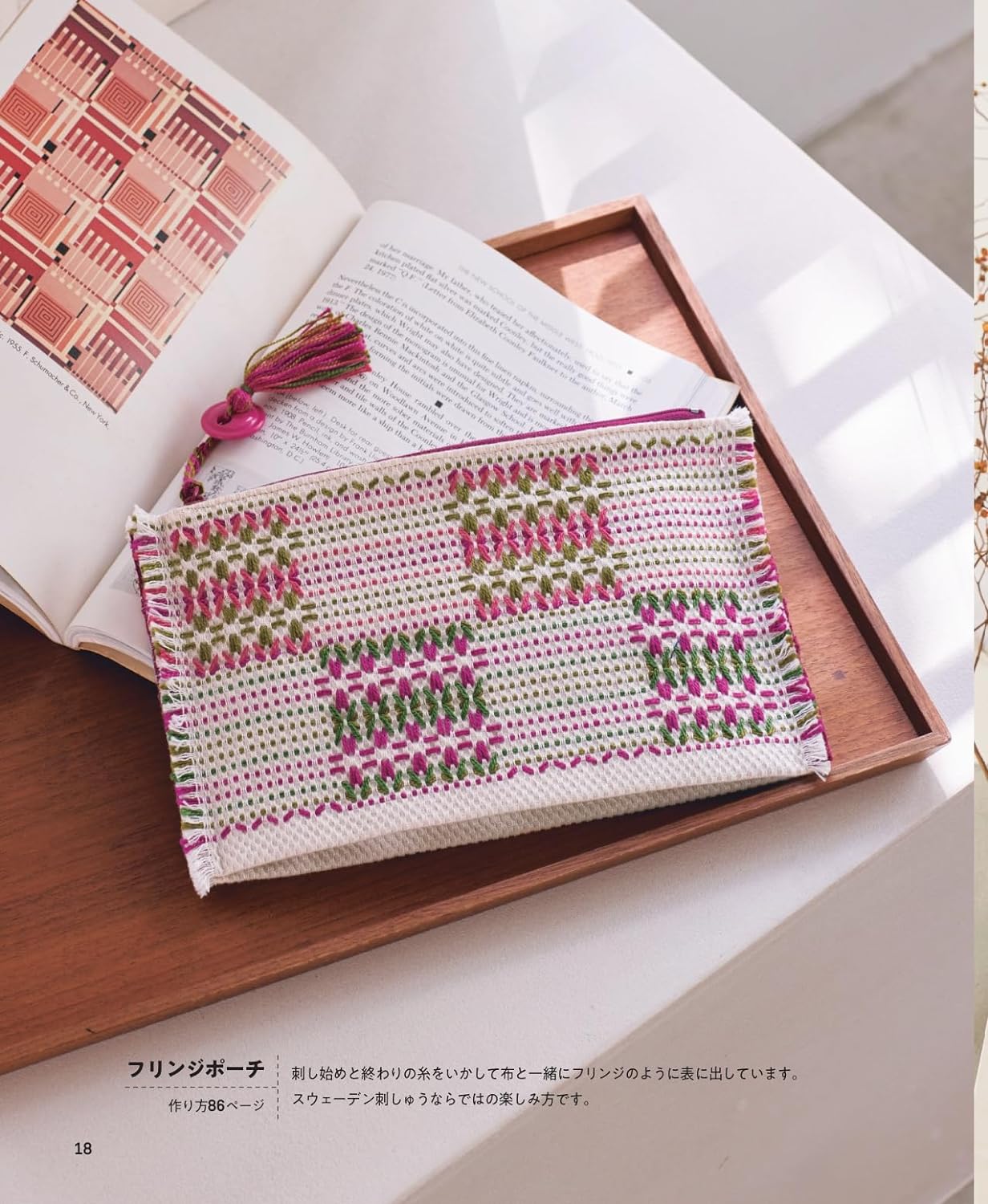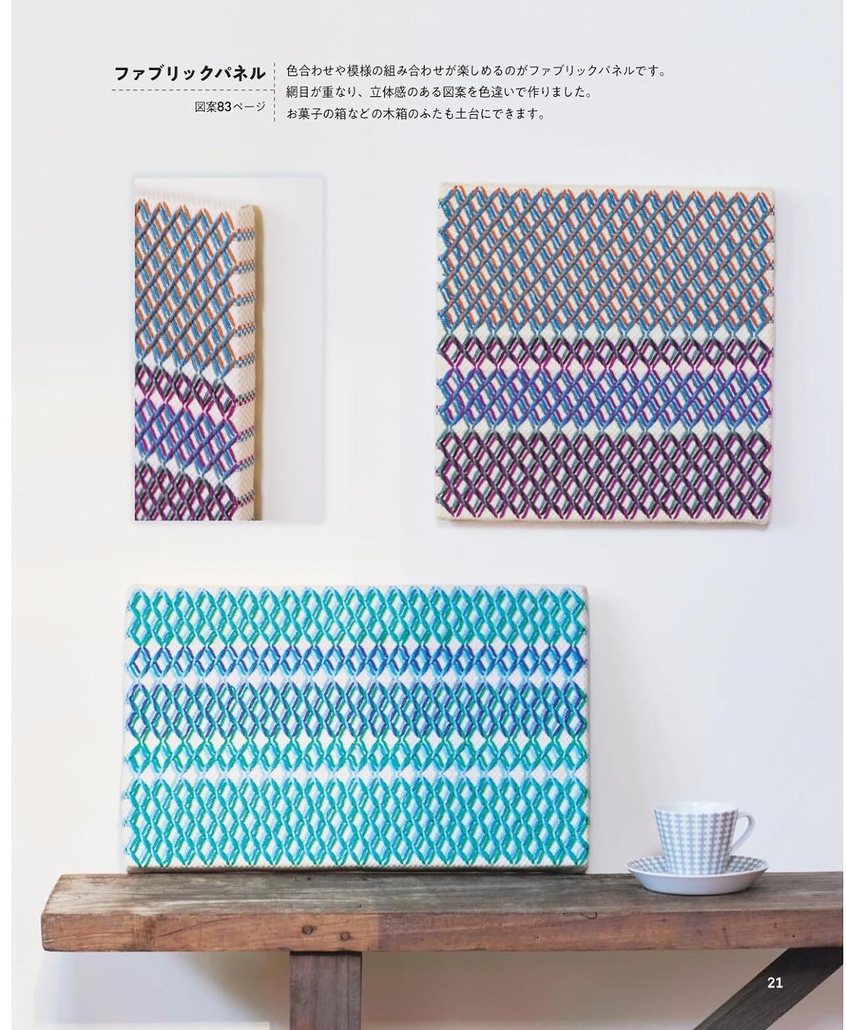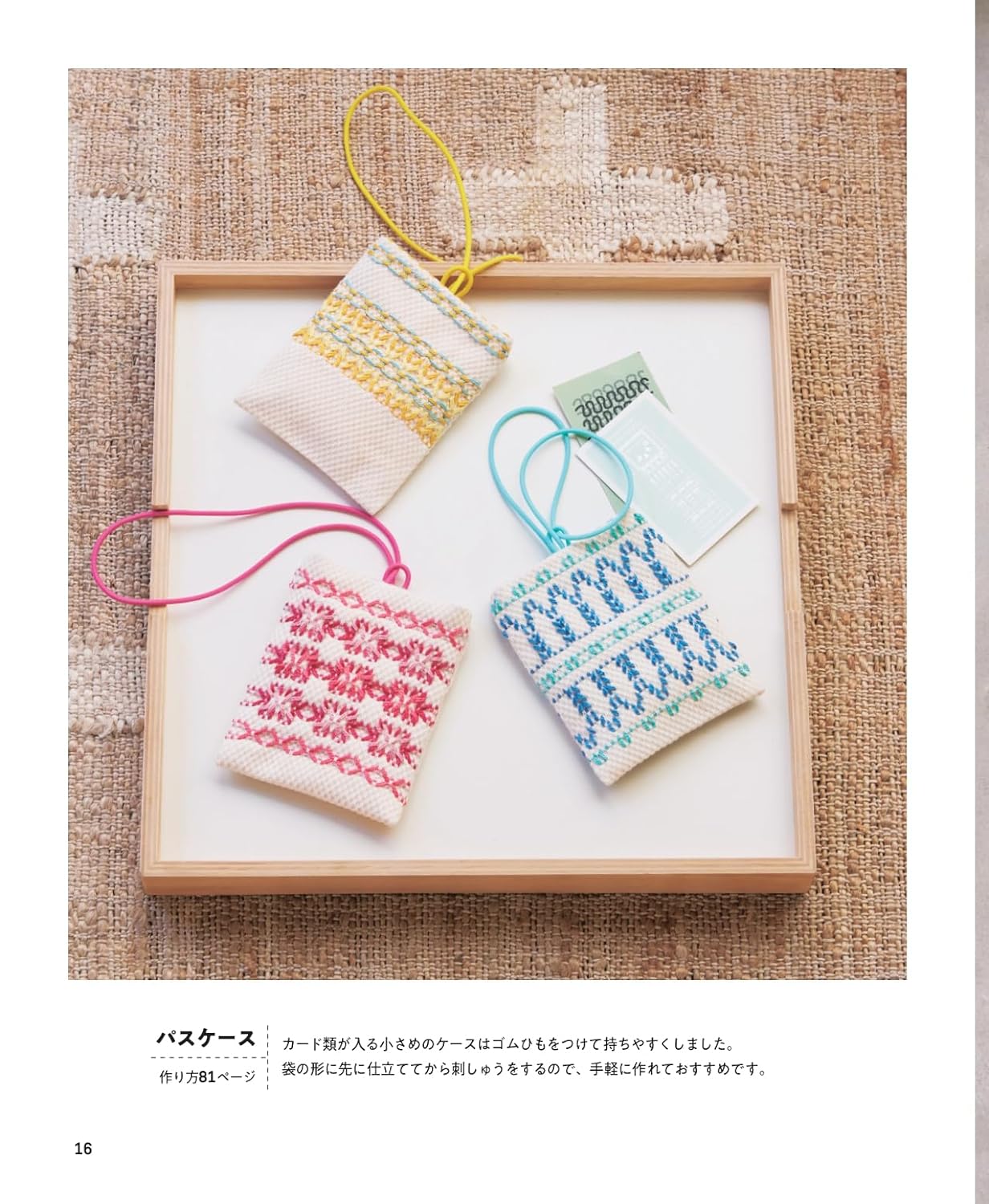 It's a simple technique that draws patterns by skimming the weave of cloth, but it's fun to create a variety of variations by combining patterns and colors. From easy-to-make pouches to bags and interior accessories. We will introduce a rich variety of designs and practical examples of works.