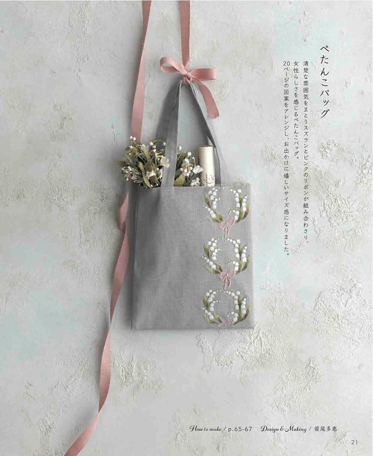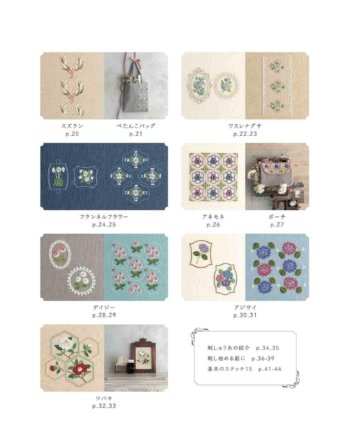 A collection of European embroidery designs that make flowers look beautiful and decorative. We introduce designs based on popular flowers such as roses, tulips, white clover, lily of the valley, violets, forget-me-nots, hydrangeas, and camellias, combined with frames, lines, ribbons, and lace to create one-point, continuous patterns. With a wide variety of designs, this book can be enjoyed by those who like flowers, patterns, girly, and romantic tastes. We will also introduce how to enjoy embroidery by actually making embroidery designs into bags and pouches, and by displaying them in frames. The material is natural cotton, and the embroidery thread is DMC No. 25 embroidery thread. Includes a detailed explanation of the basics of stitching.