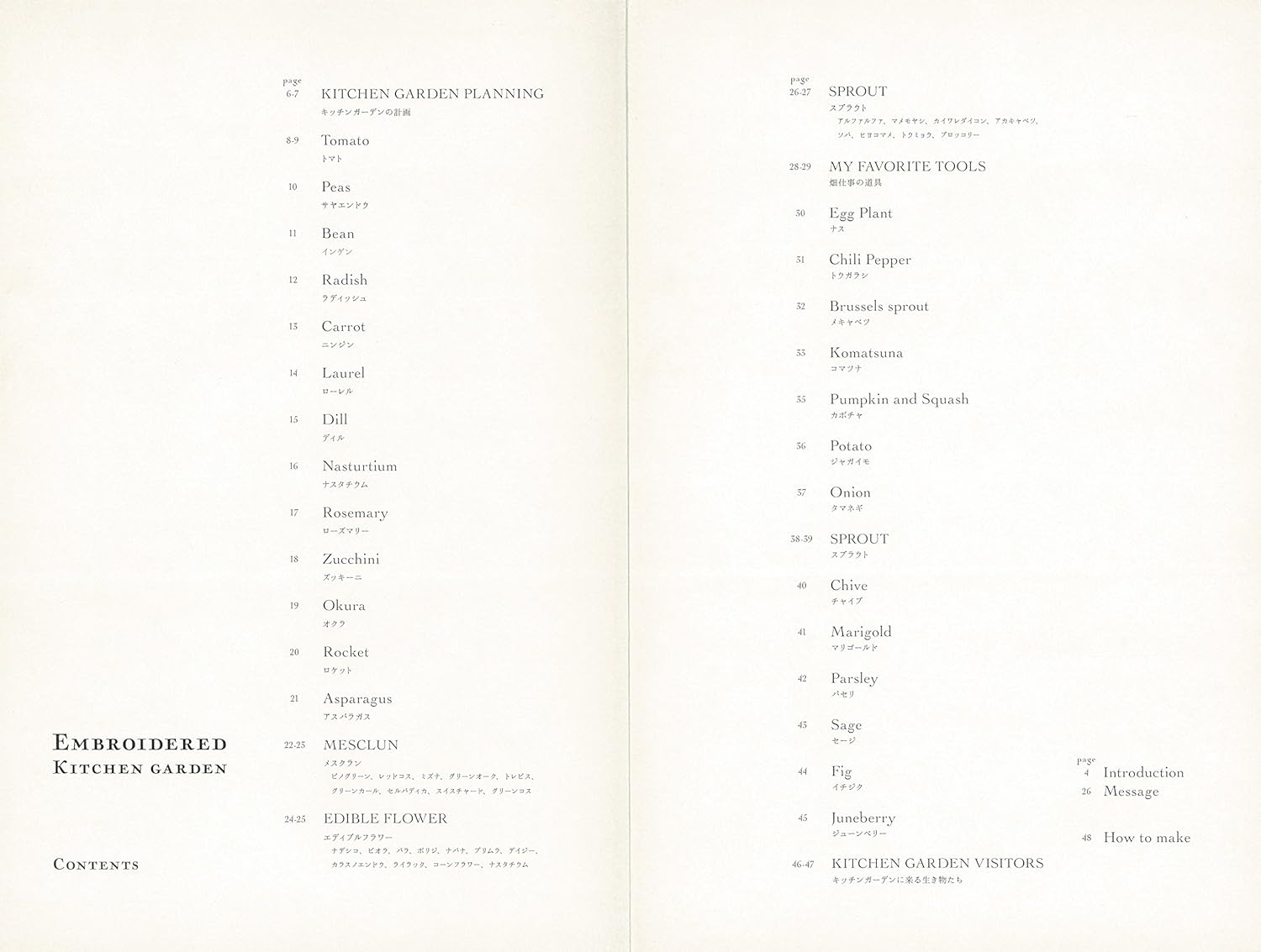 Following on from the ``Garden Flower Illustrated Book'', this book uses free embroidery to express vegetables that can be grown in the garden (kitchen garden). Vegetables such as tomatoes, carrots, and pumpkins, herbs, fruit trees, edible flowers, tools, and small creatures also appear.