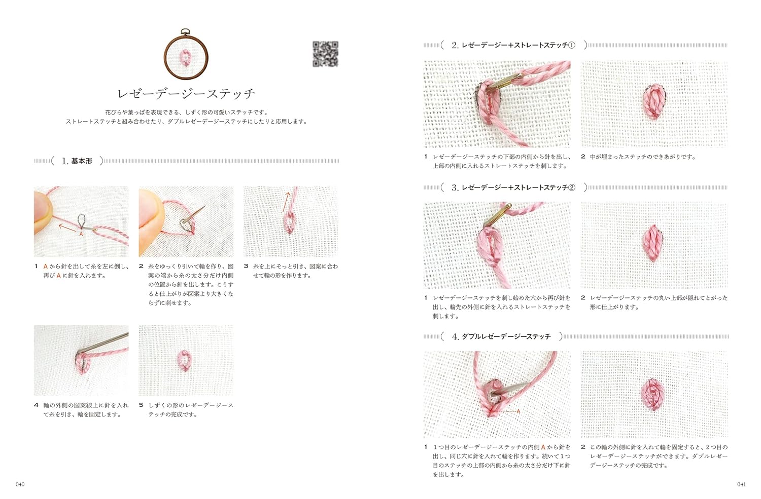 ●In the first half of the book you will learn the basics of embroidery and 22 stitches. The stitching instructions are explained in detail in easy-to-read photos, and QR codes for viewing videos are included on each page. In addition to the basic shape of the stitch, many applied versions and variations are also introduced, so you can reproduce various textures of the flower. There are as many simple flower designs as you can stitch to practice before you try your hand at more serious work!