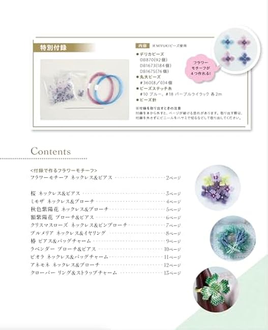 It comes with an appendix that includes beads, needles, and thread to make four flowers.