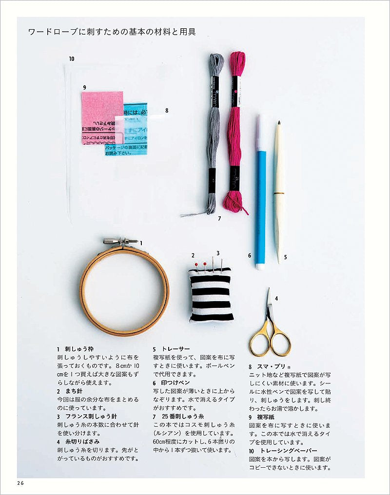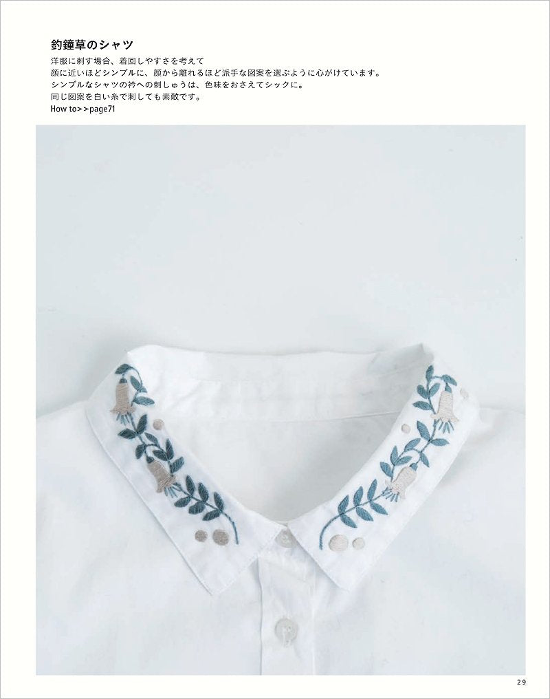 There are two main points to keep in mind when stabbing clothes. One is to choose the design and color by thinking about how you will wear it. Another thing is that there are different ways of copying and stitching designs depending on the material. This book provides detailed explanations of points to consider when embroidering a variety of wardrobe items, such as shirt collars, T-shirts, skirts, and knitwear, using practical examples.