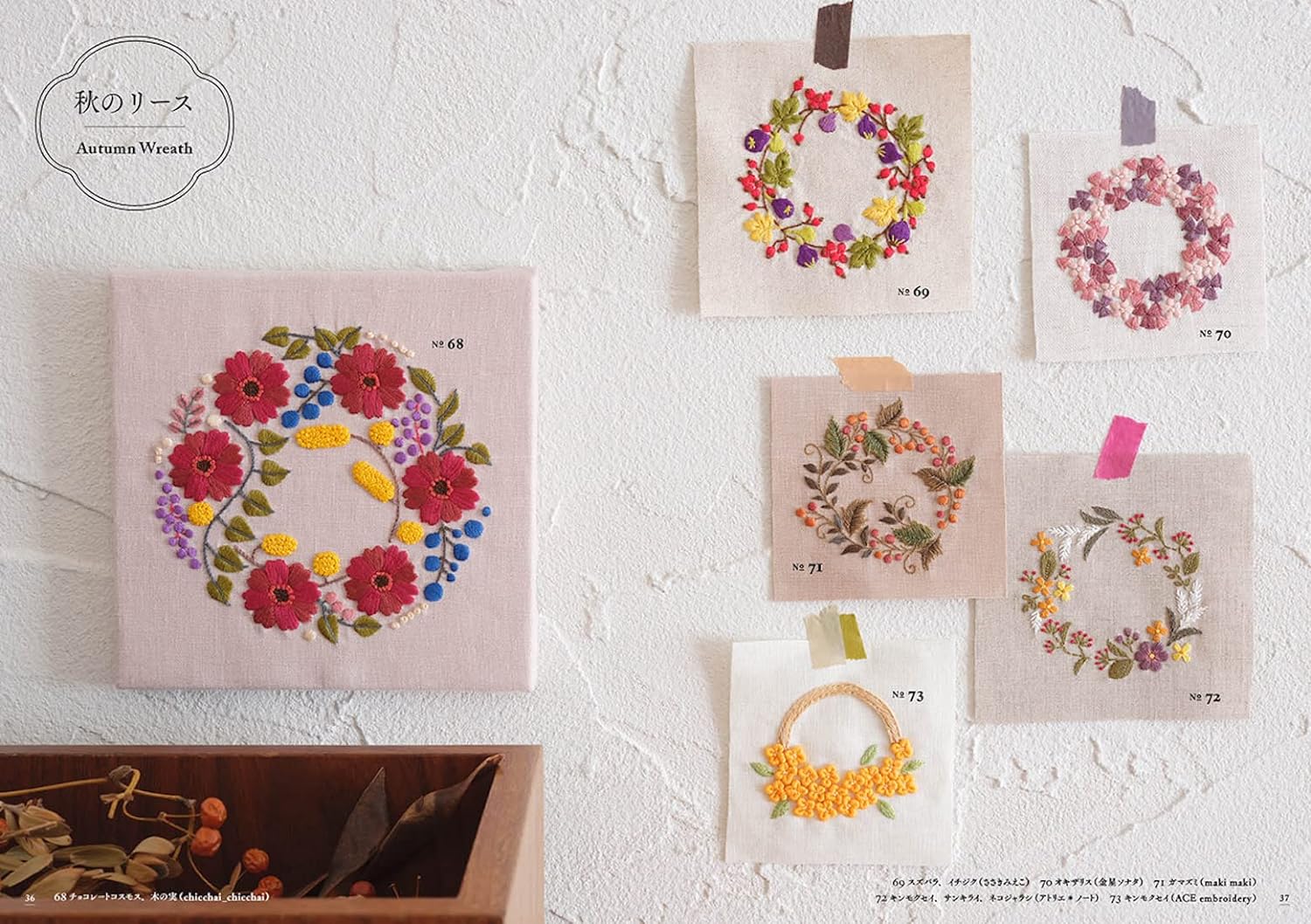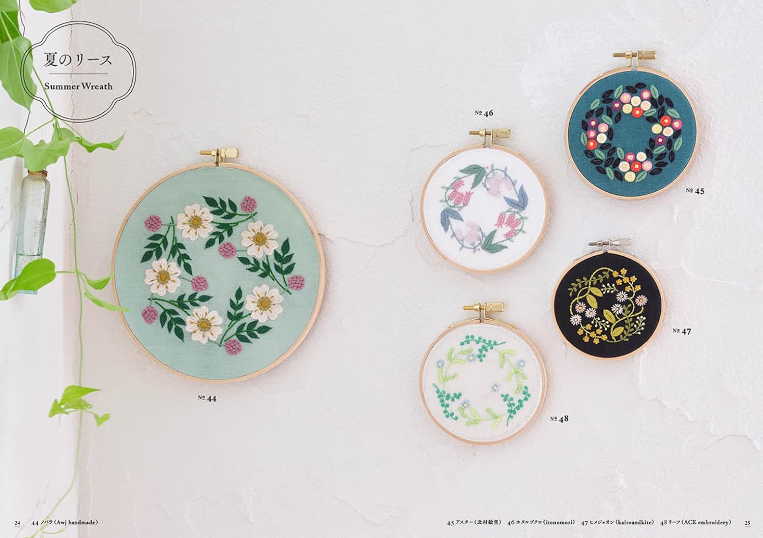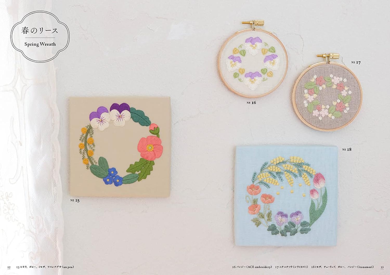 Introducing samplers of spring, summer, fall and winter wreaths and bouquets by multiple artists. This book allows you to enjoy the breadth and richness of embroidery expression.