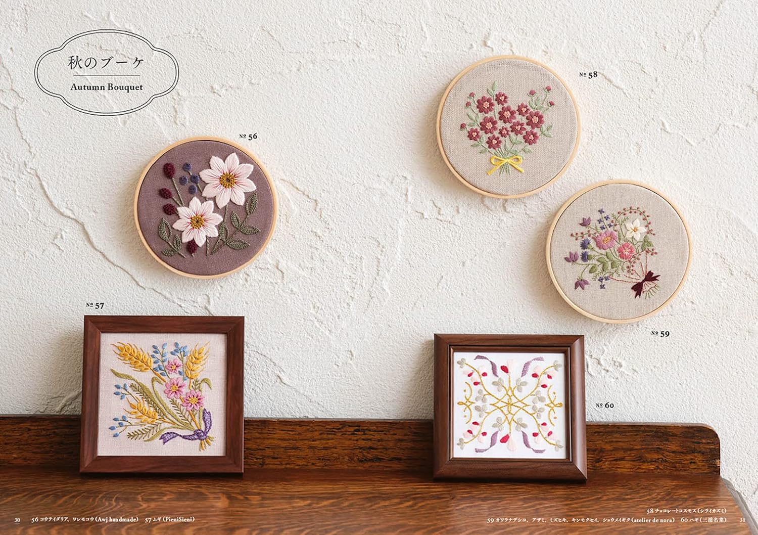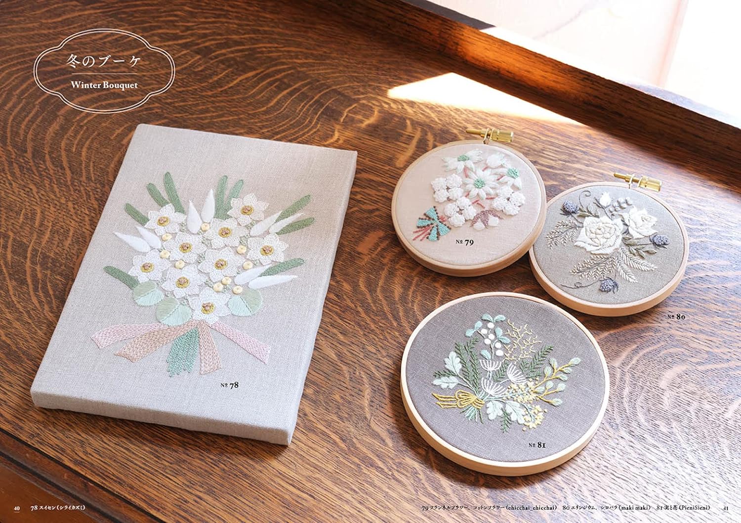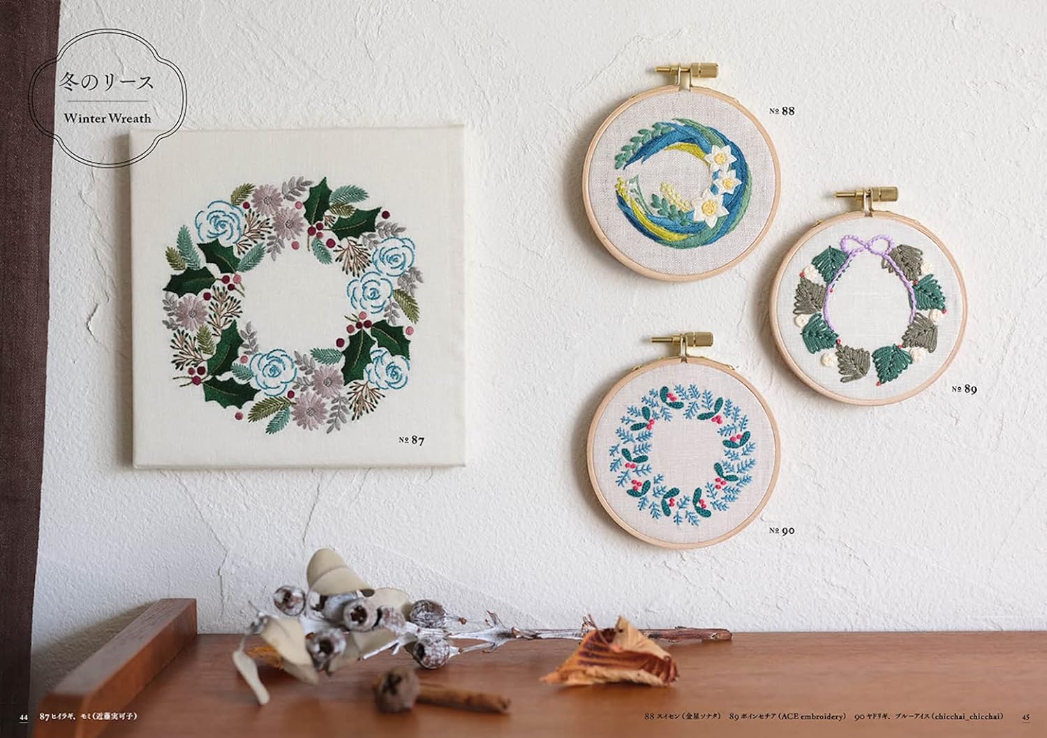Introducing samplers of spring, summer, fall and winter wreaths and bouquets by multiple artists. This book allows you to enjoy the breadth and richness of embroidery expression.