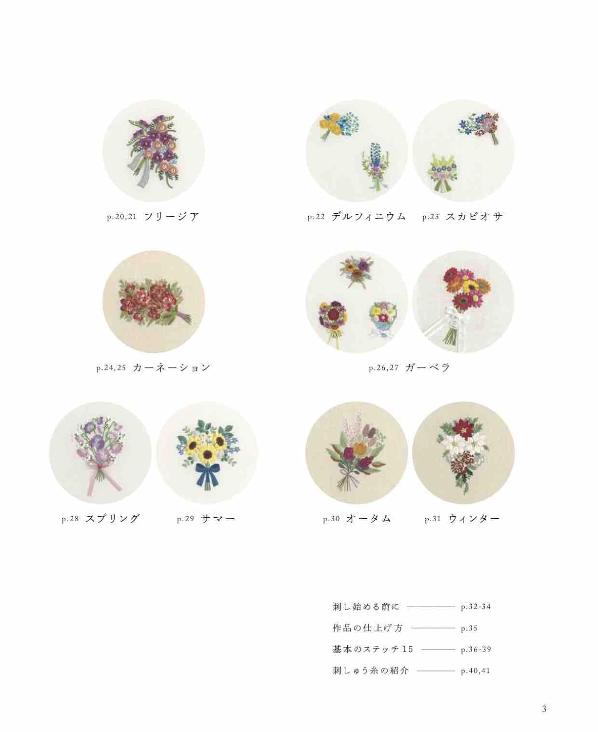 We offer a wide variety of flowers, including popular ones such as roses, gerberas, tulips, mimosas, lavender, and pansies, as well as seasonal flowers such as sweet peas, sunflowers, rice, and poinsettias based on the Four Seasons theme. The material is natural cotton. The embroidery thread is DMC No. 25 embroidery thread. Includes a detailed explanation of the basics of stitching.