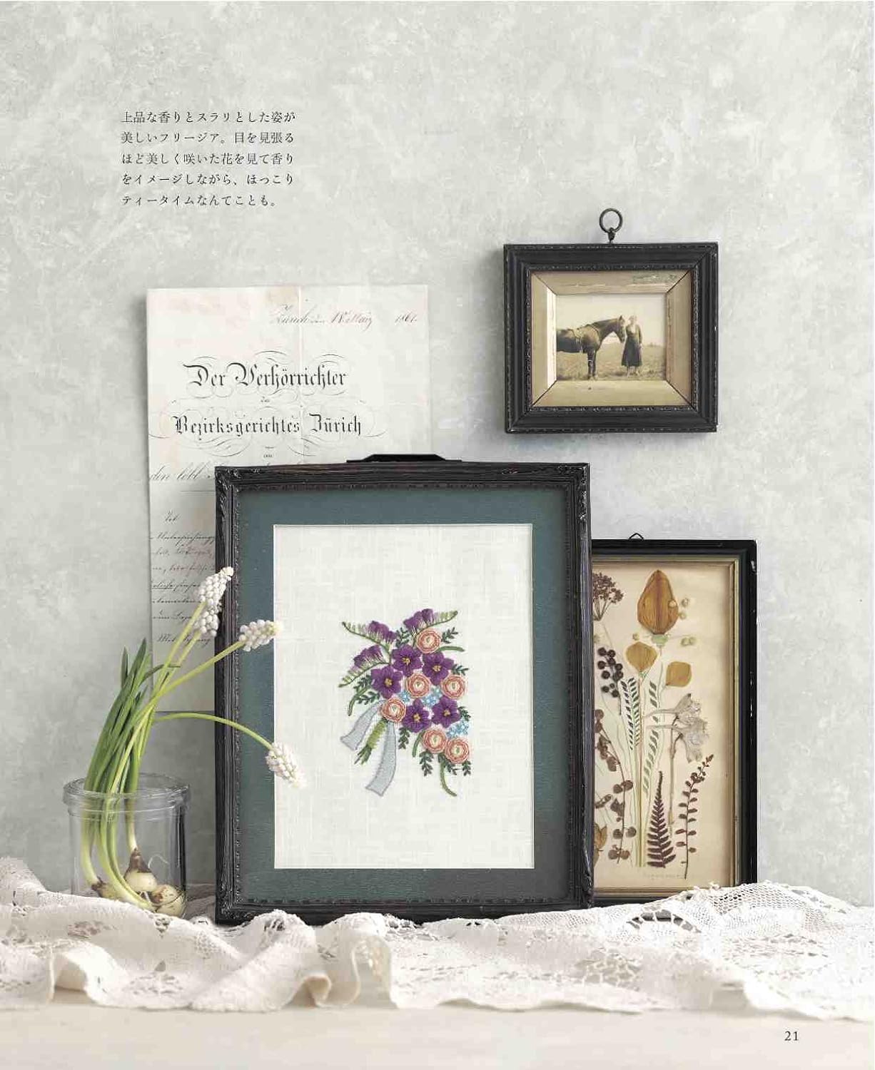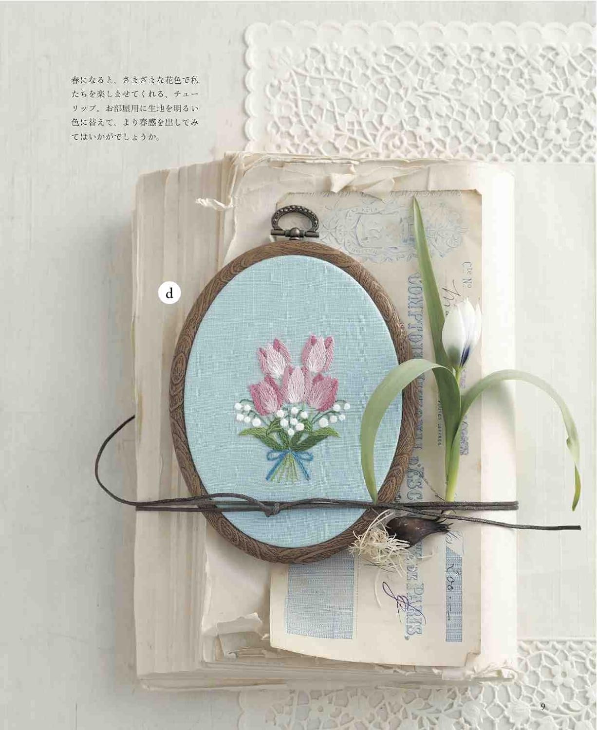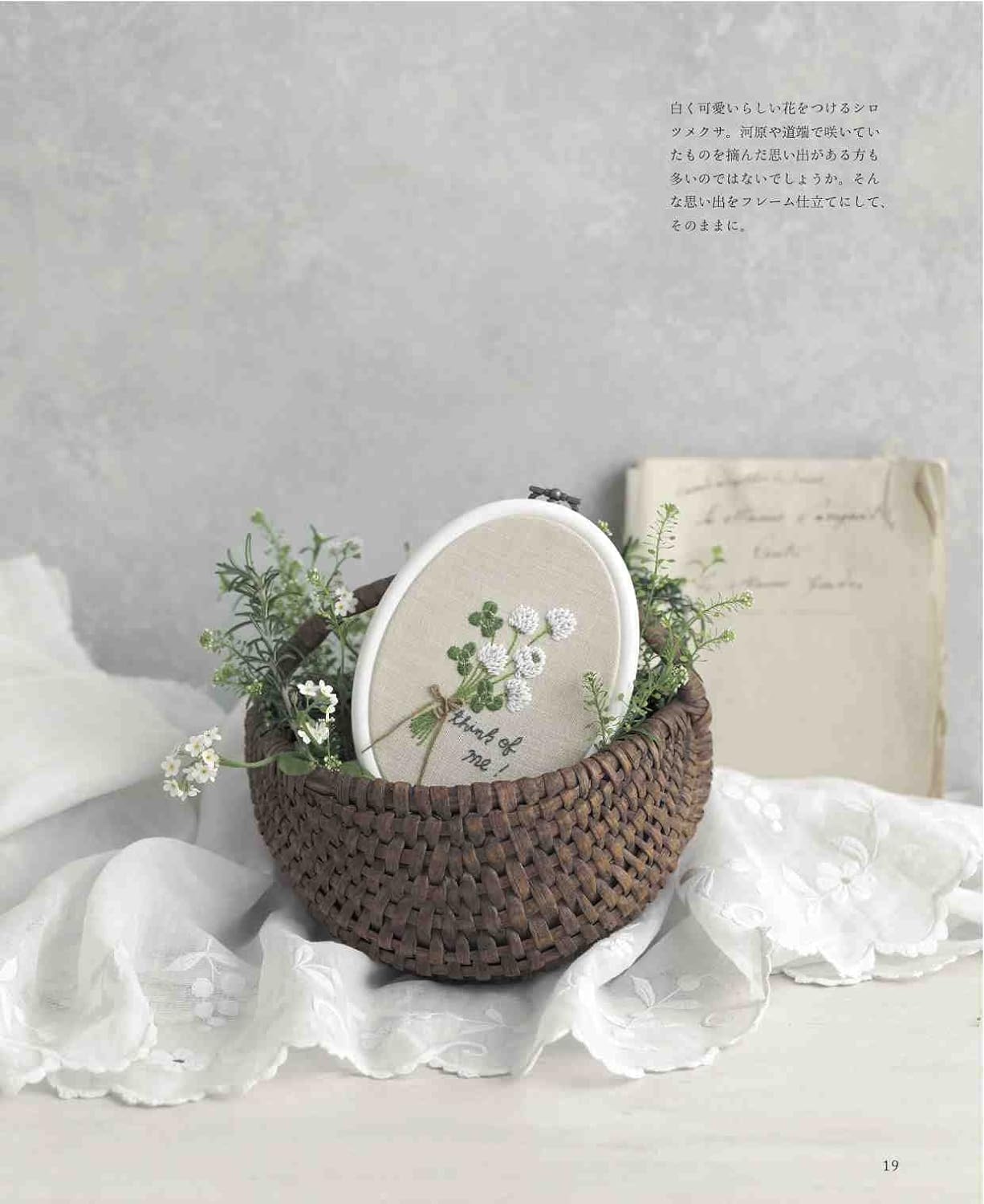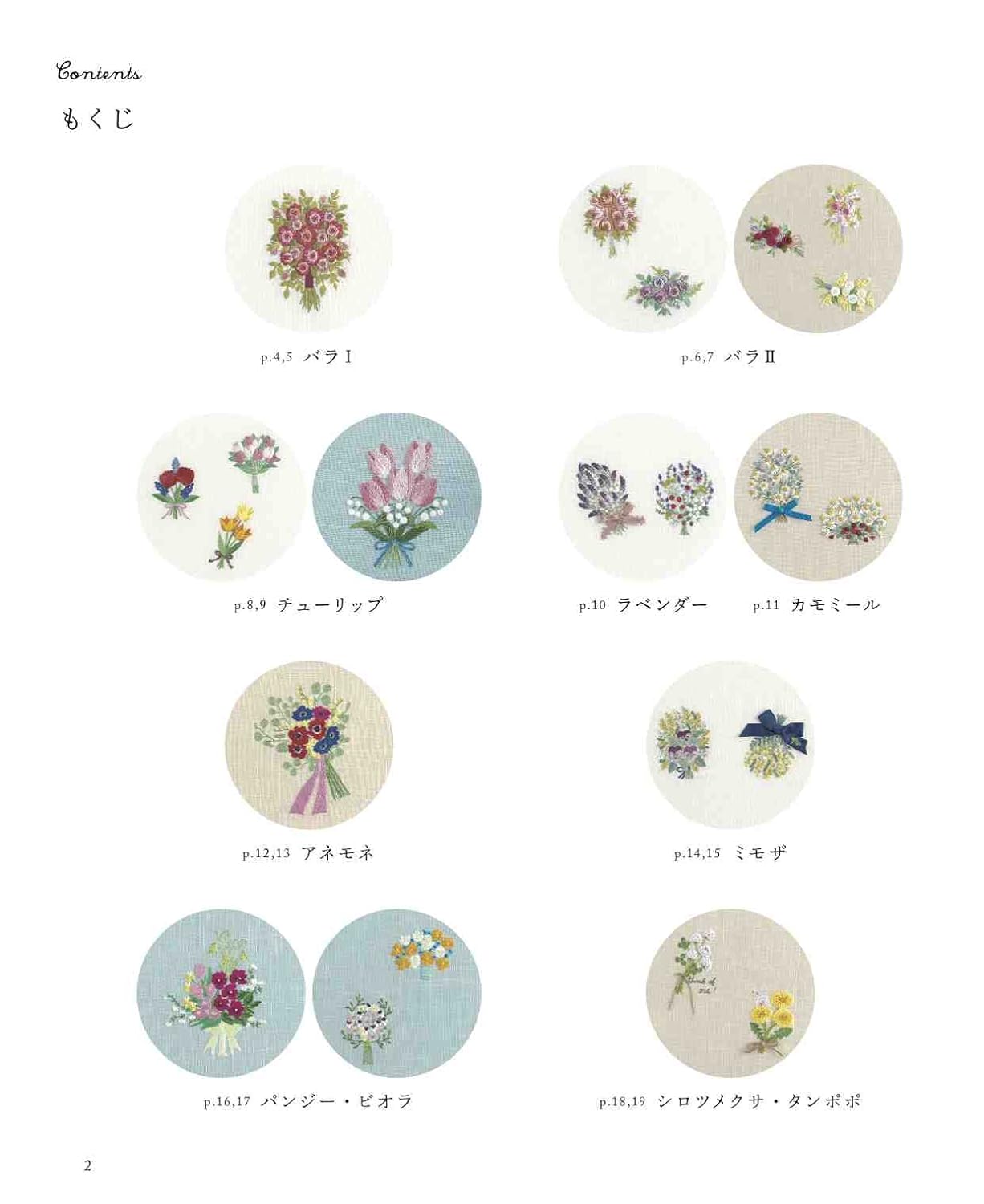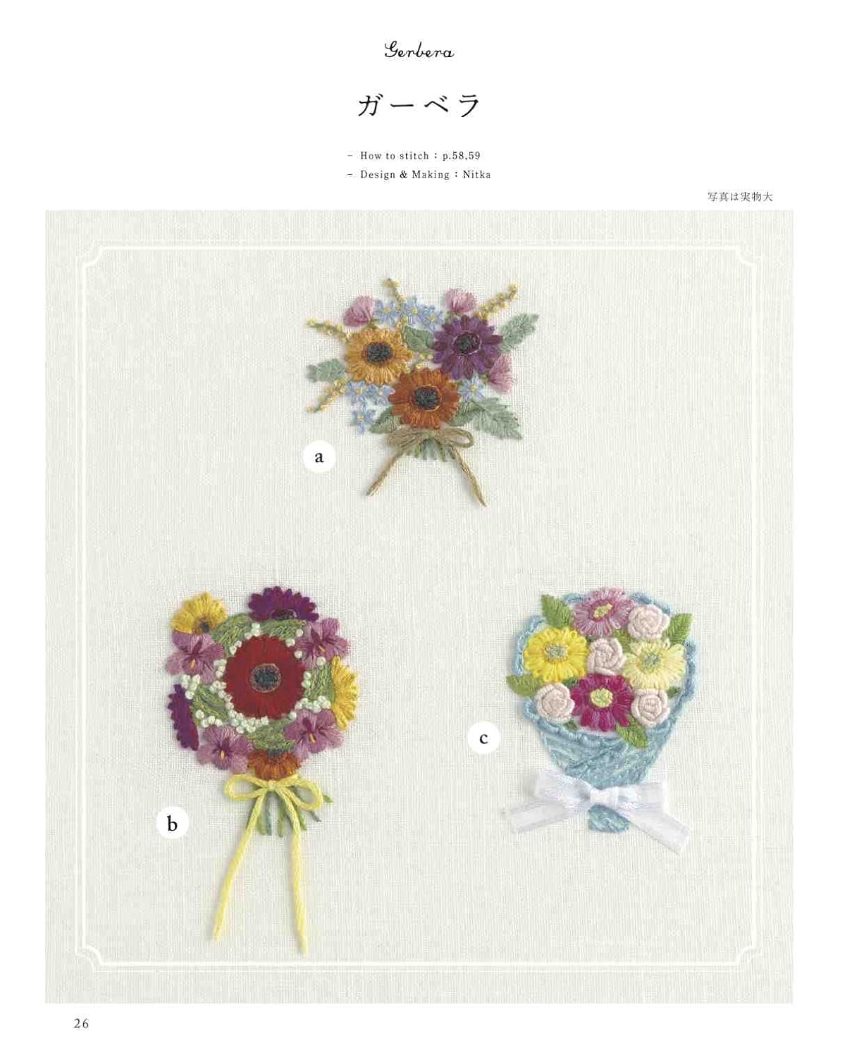 A collection of bouquet designs embroidered with European embroidery. We propose a bouquet design based on the concept that you can decorate your room by placing it in a frame, just like decorating a vase in your room. The pattern size is available in two sizes: small and large. Examples of use in embroidery frames and frames are also included.