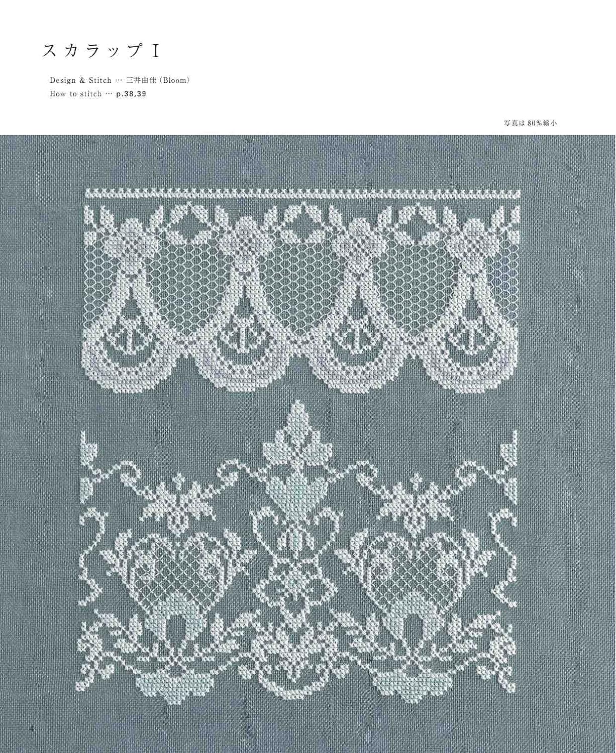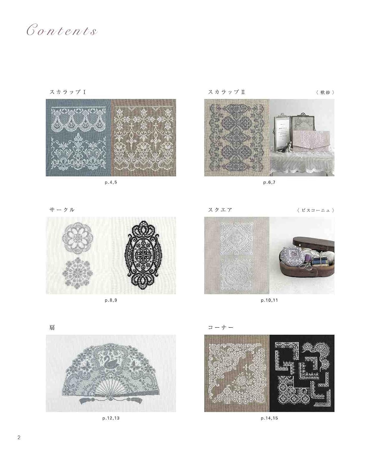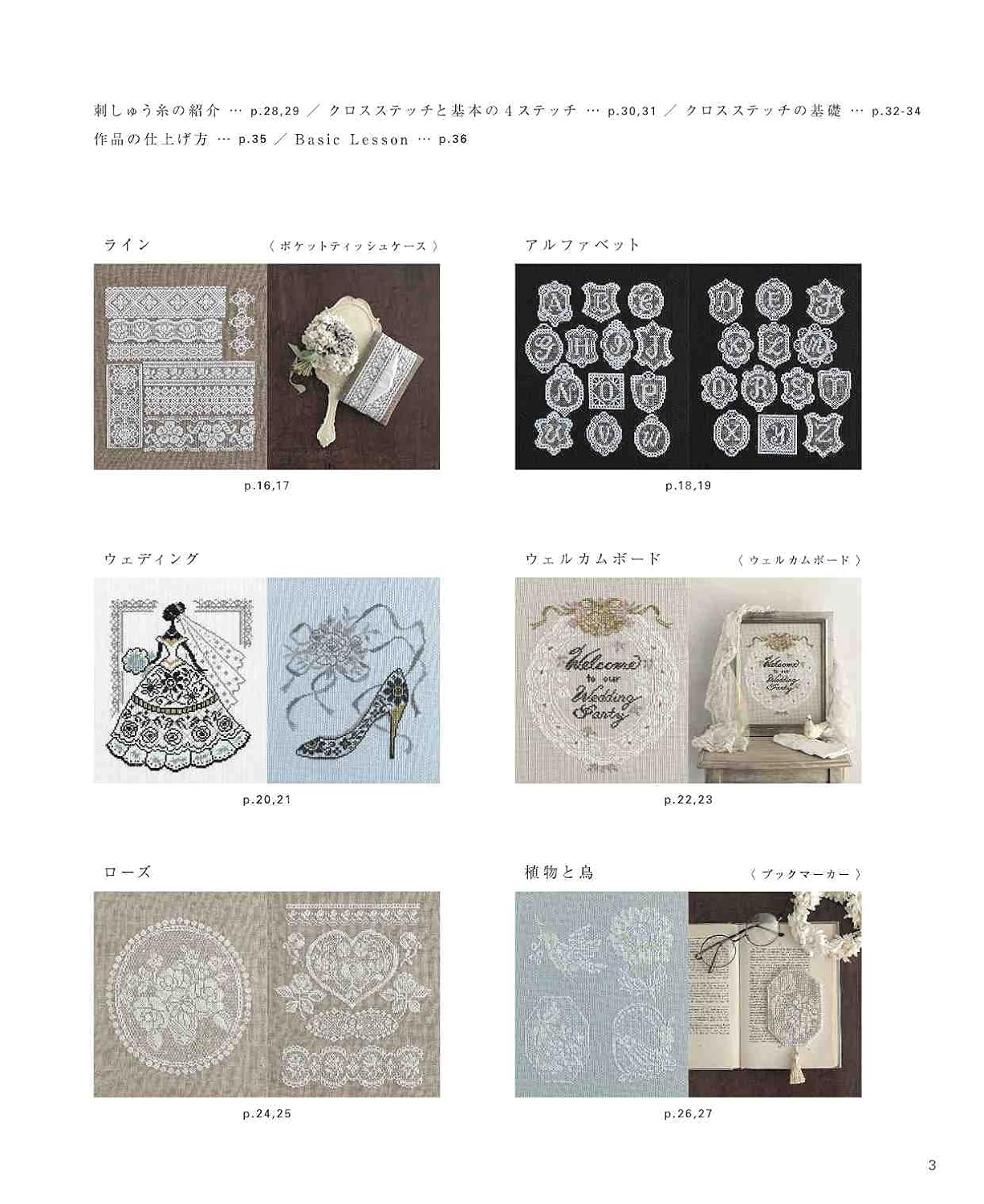 Lace has been used as a fashion item in a variety of items, and has captivated people throughout the ages. This book introduces such delicate and gorgeous lace in cross-stitch designs. Themes include scallops, fans, lines and corners, the alphabet, wedding-themed dresses, welcome boards, and elegant roses. With a wide variety of designs, this book will be enjoyed by those who like girly and romantic things. We will also introduce ways to enjoy embroidery, such as embroidering the embroidered designs onto items you already have, or framing them and displaying them in your room. The technique is cross stitch. The material is cross stitch cloth, linen. The thread is #25 embroidery thread. Also includes a detailed explanation of the basics of stitching.
