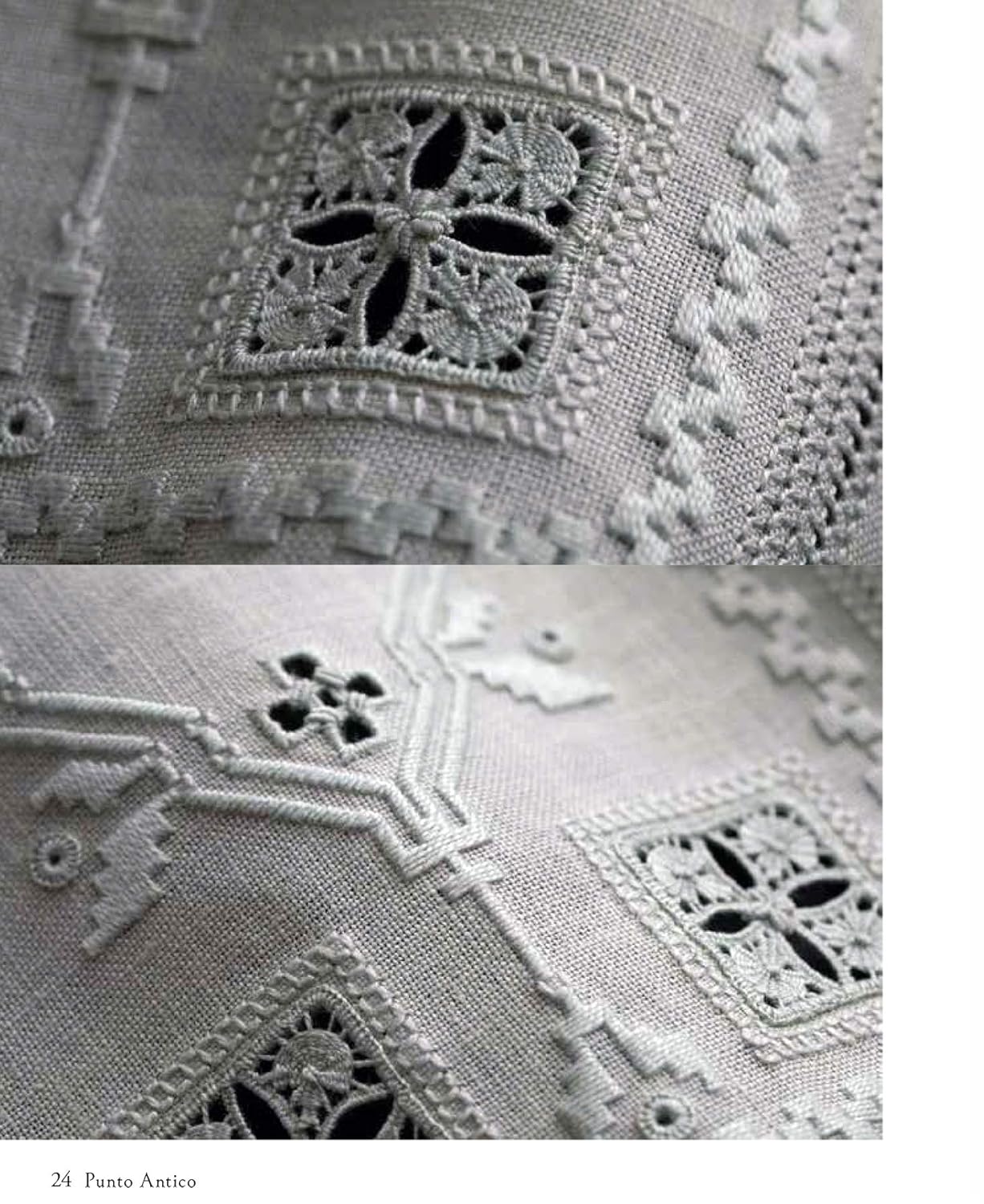 This embroidery, which has the names punto stitch and antico ancient, is said to be the ancestor of doron work and hardanger embroidery, which involves counting the threads of cloth, pulling them out, and adding stitches.