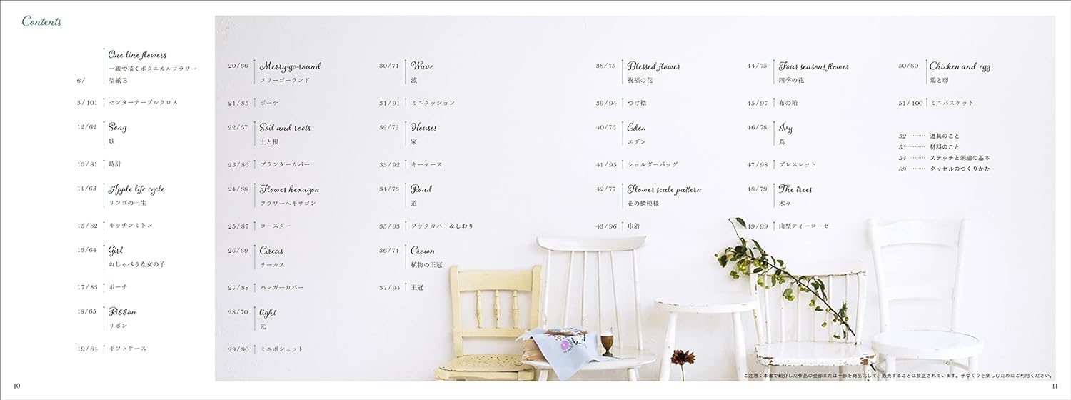 This book is a collection of connections. Embroidery is an expression of connections using thread. A comfortable art that connects each stitch, conveys thoughts and joy, and is cultivated in a relaxing time. I always embroider with this feeling. I imagined many fun things and created designs with various connections through dialogue between the needle, thread, and fabric.