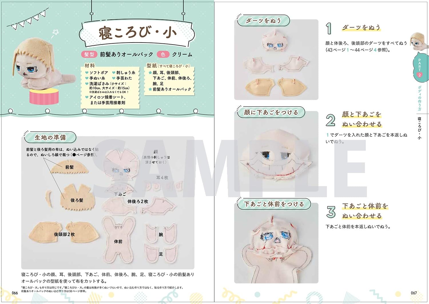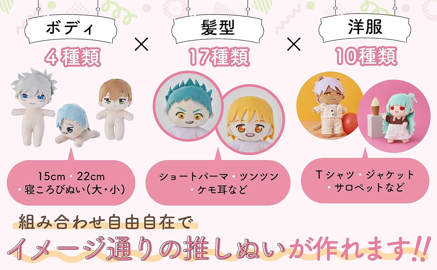 You can make four types of bodies: a 15cm size that is easy to carry and dress up, a larger 22cm size, and a "lying down" (large and small) that is facing you in a pose close to lying down.