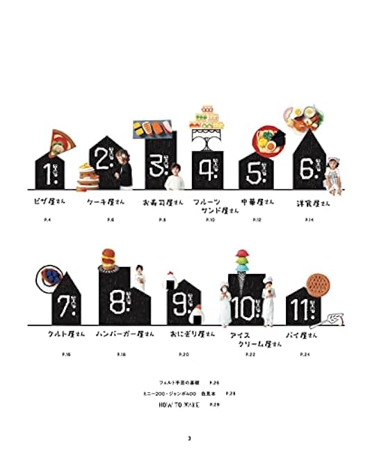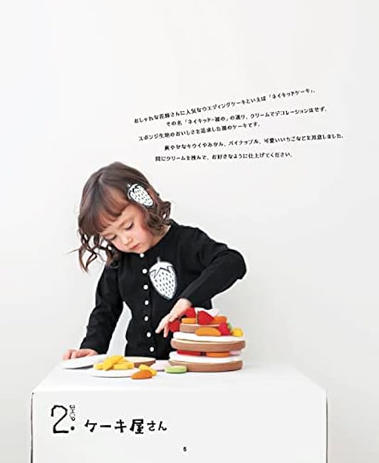 Felt handicrafts are popular among both young and old people. One of the most requested items from our readers is ``items that they can play with their grandchildren,'' and this time we focused on the most popular item, ``food stores.'' This is an item where you can enjoy pretending to be a shop such as a sushi shop, hamburger shop, fruit sandwich shop, etc. The works were designed by minimofuu toy, Mametaro Omocha, fru felt, and Megumi Higo. The works in this book can be created and sold without copyright, and can be used in bazaars, etc. All of the felt used is Sunfelt's Minnie 200, and the color numbers are listed on the materials. The basic page also introduces how to copy the pattern, basic sewing methods, explanations of materials, and color samples.