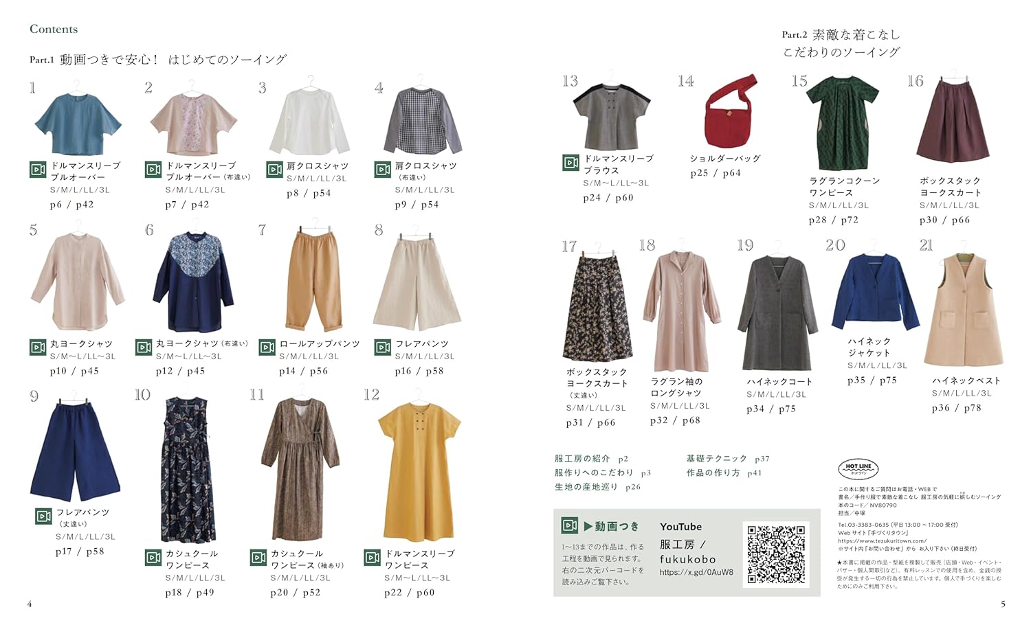 This book is written by Yoshimi Komura, who runs a sewing class called ``Clothing Studio'' in a renovated old folk house in Izumo City, Shimane Prefecture, and also sells patterns for clothes. Komura's characteristic simple design combines fashion, functionality, and comfort, and the book features 12 types and 21 items of clothing with simple, easy-to-sew lines and shapes. For about half of her works, the process of making them will be shown on YouTube. Available in sizes S, M, L, LL, and 3L, with actual large paper including seam allowance.