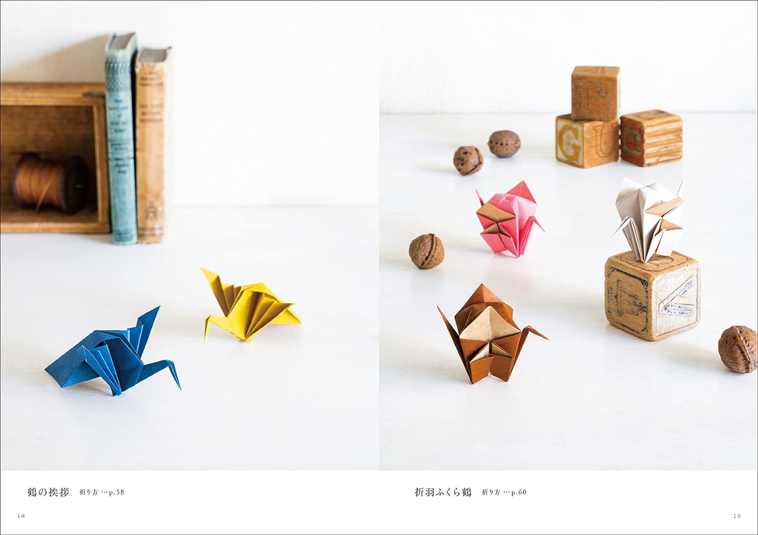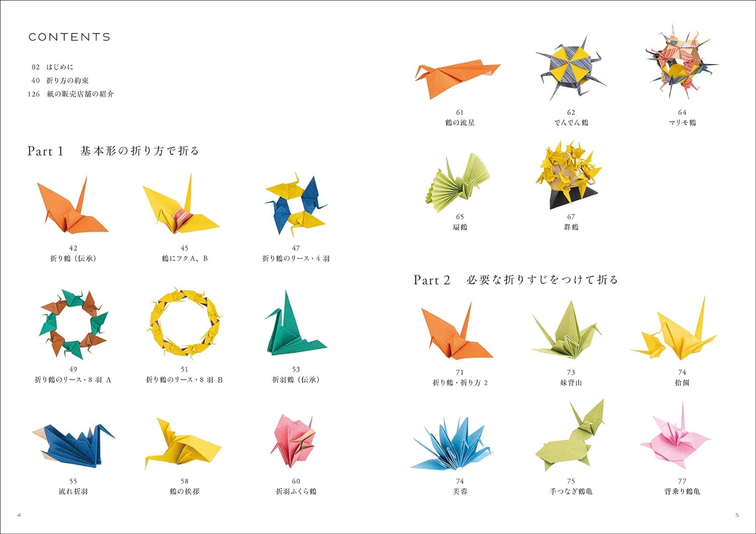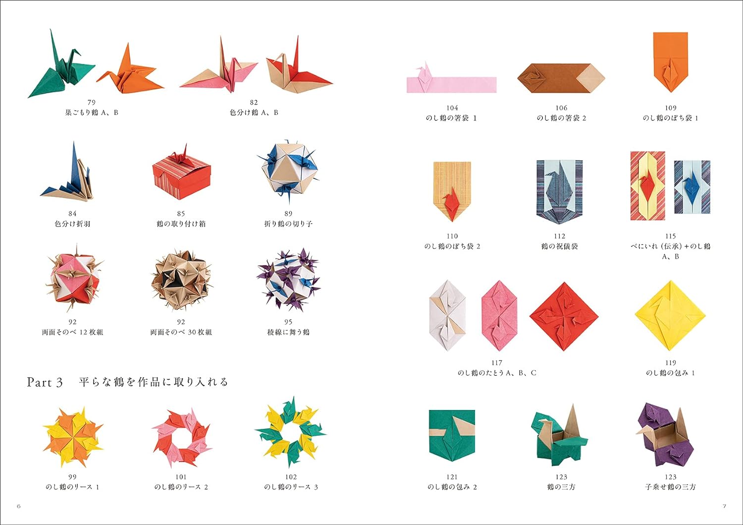 This book is divided into three chapters: works based on traditional origami cranes, works that are assembled after adding the necessary fold lines, and works that use flat origami cranes called noshi-tsuru. We will be introducing 45 works using origami cranes, such as cranes, wreaths, lotus cranes, chopstick bags, wrappers, and unit origami.